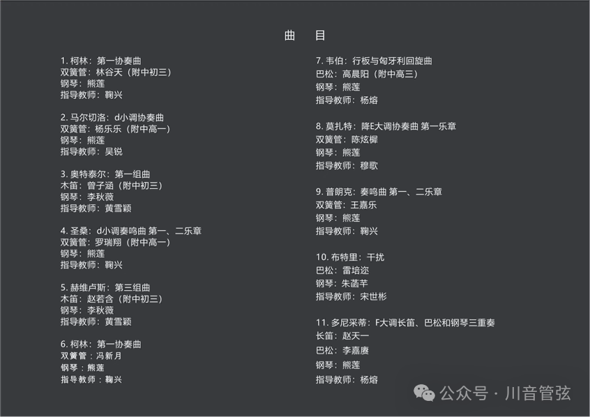 本场音乐会是巴松、双簧管、木笛三个专业方向的教学成果展演,也是同学们一次宝贵的舞台实践。音乐会上共有来自川音附中、本科、研究生各年级的12位同学登台演奏,曲目涵盖了巴洛克、古典、浪漫以及现代等各个时期的作品,音乐会得到了在场师生的热烈欢迎和一致好评。