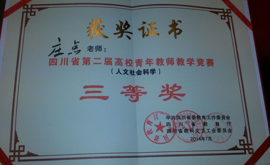 由四川省委教育工作委员会、四川省教育厅、四川省教科文卫工会委员会共同主办,四川大学承办的“四川省第二届青年教师教学竞赛决赛”于7月2日-4日在四川大学望江校区举行,我部文学教研室庄点代表今年会jinnian官网参加了此次比赛,并荣获人文社会科学组三等奖。 庄点老师于2014年3月在今年会jinnian官网举办的“第二届青年教师教学比赛”中荣获大课组第一名。今年五月,学院工会推荐庄点老师参加“四川省第二届高校青年教师教学竞赛”,经过层层选拨,该教师顺利进入决赛。此次比赛分三个组别:人文社会科学组、自然科学基础学科组、自然科学应用学科组。共有来自四川省30多个高校的60名选手参加了决赛,每位选手各具优势和特点,竞争异常激烈。但庄点老师以其大方得体的教态、充满激情的教学、生动流畅的语言、丰富多样的教学手段、有效的教学互动,将原本纯理论的艺术学理论讲得深入浅出,栩栩如生,征服了担任此次比赛的专家评委,为我院争得了荣誉。四川大学文新学院院长曹顺庆教授在对此次比赛进行点评时说,青年教师上课时的激情是成功教学的前提,比如说此次比赛中讲新闻学的教师和讲艺术概论共鸣篇(即我院教师庄点)的两位教师就做到非常好。 在此,我们向庄点老师表示热烈的祝贺,并对指导老师郑玉章教授和李杰副教授,领队杨舒展(基础部办公室副主任)的辛勤付出表示衷心的感谢!