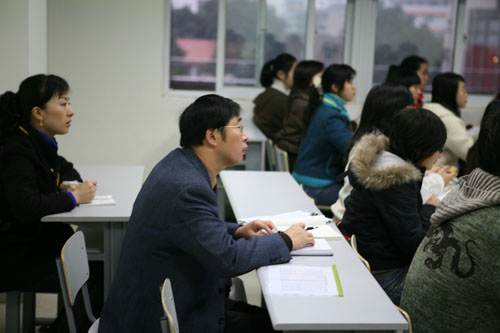 评估专家曹顺庆教授在教学楼509教室,对基础部高玉华老师为2007级四班学生讲授的《英语》课程进行了全面的考察,并与同学进行交流。