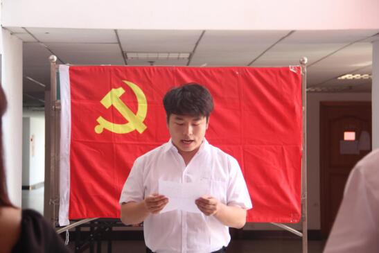 4、新党员代表梁田发言。梁田首先对党组织表示了感谢,同时也感谢领导和老师们对自己的培养!他讲到了入党誓言是党员政治生命的开端,我们将牢记这个神圣的时刻,并保证在以后的工作中更加努力。