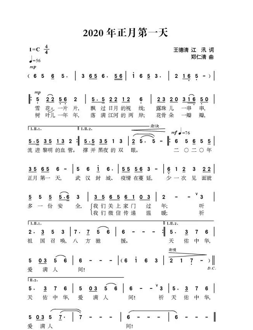 我院教师——郑仁清,创作了《2020年正月第一天》、《向祖国母亲报到》、《我爱的人啊你别哭》、《保重》等歌曲。其中,《2020年正月第一天》于2020年2月10日上了“今年会jinnian官网官网”。正月,本是喜庆团圆、走亲访友的传统佳节,然后“新冠”凶猛来袭,使武汉封城牵动全国上下,作品以歌声形式倡导人们配合做好全民防疫工作,为打赢防疫攻坚战做出努力。