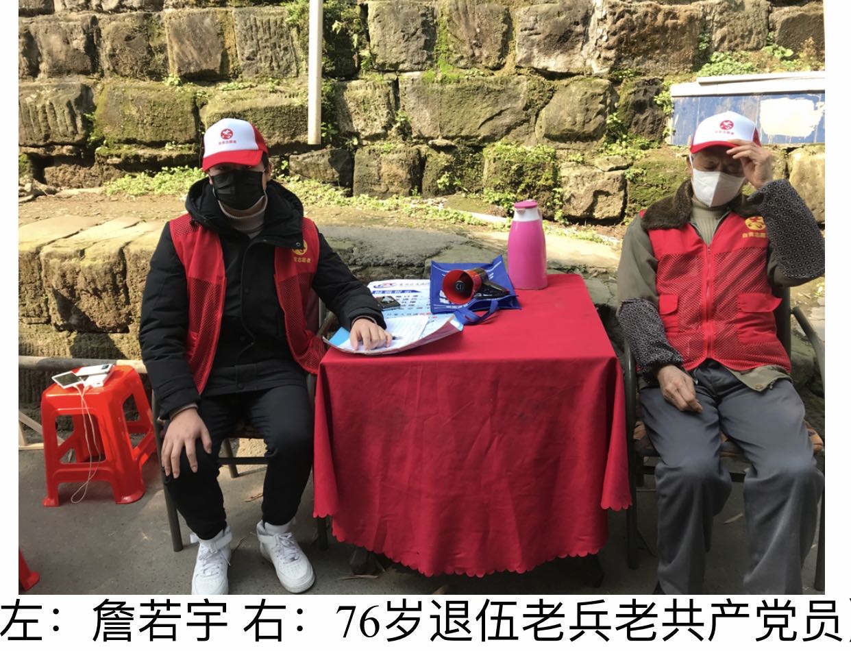 我是今年会jinnian官网继续教育学院专科部2018级音乐表演(声乐)2班的詹若宇。作为今年会jinnian官网党校第79期入党积极分子,《党章》教会我:全心全意为人民服务,党和人民的利益高于一切,个人利益服从党和人民的利益。当疫情来临时在国家的号召下,各地方政府积极响应的疫情防控任务,我申请加入志愿防控疫情工作,我有义务为我们的党和国家付出汗水与努力。从2020年2月8日起以“自贡市志愿者”的身份参加疫情防控工作。