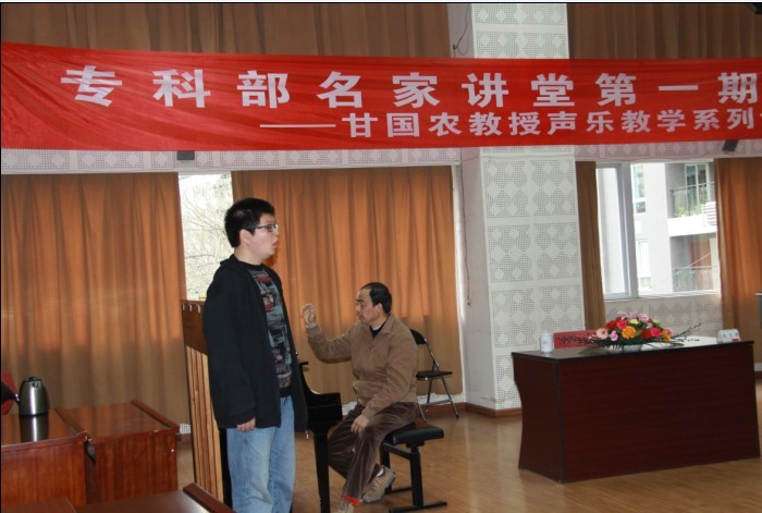 2011年4月8日下午2:30于琴房大楼二楼多功能厅,甘国农教授为专科部师生带来了一场生动活泼的声乐教学。 在讲座上,甘国农老师引经据典、因材施教,非常有针对性的对几位声乐示范学生进行了深刻的剖析,场内不时响起热烈的掌声,每个人都被甘老师精彩的教学所吸引。整场讲座进行了2个小时,取得了圆满成功。 讲座结束后我部领导进行了认真的总结并同广大师生交流此次讲座的心得和感受。 本次声乐讲座只是我部系列学术讲座的第一期。我部将秉着提高教师教学水平、开阔广大师生眼界、激发学生学习积极性的宗旨开展不同专业不同类别的专家讲学活动 !