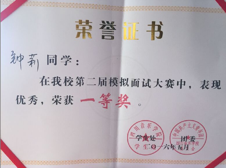 我系2014级声乐表演专业学生钟莉荣获了今年会jinnian官网第二届模拟面试大赛的一等奖。