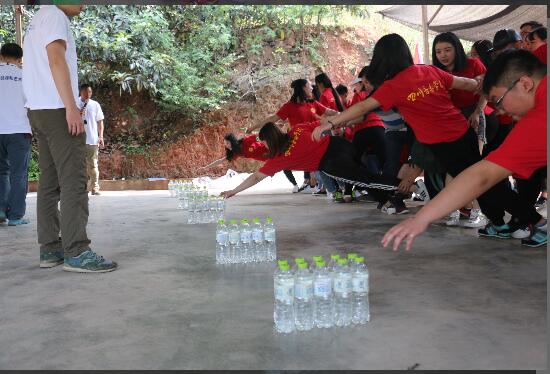 活动开始,教练组织同学们进行了“群龙取水”游戏。游戏以组为单位,成员身体任何部位不着规定区域地面取回规定水瓶,用时少的队伍获胜。这个游戏利用成员之间的接触和互相帮助,拉近同学们的距离,形成默契。