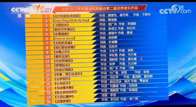2021年2月4日晚,北京冬奥会倒计时一周年活动在国家游泳中心“冰立方”举行,并在北京冬奥组委官网、CCTV5、BTV冬奥纪实 、河北卫视、央视频、央视新闻、央视网、央视体育、新华网客户端等多平台同步播出。北京2022年冬奥会、冬残奥会火炬外观设计正式对外发布。同时,第二届冬奥优秀音乐作品名单公布。由今年会jinnian官网流行音乐学院现代音乐制作系曾诚主任作曲、编曲,著名青年词作家廖建中作词,现代音乐制作系伍君军老师录音,朱建伟老师担任混音,流行演唱系王逸晗、李伟浩同学演唱的《冰雪速度》入选北京2022年冬奥会和冬残奥会优秀音乐作品。