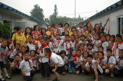 慰问团的第一站来到了什邡方亭班房小学,全体党员师生在方亭板房小学校长的带领下走进校区。什邡市方亭板房小学,是由什邡实验小学、什邡市方亭二小、方亭四小三所学校临时组合而成,有18栋板房,教师200余人,一次性可容纳4800余名学生就读。这里的孩子年龄最小的4岁,最大的只有12岁。校园干净整洁,每个教室的班级文化建设、教室外面的展示牌一应俱全,规范美观;孩子们活泼快乐,老师们精神振奋,校长热情睿智,学校井然有序,生机勃勃。一切都预示着:劫难已经过去,重生正在开始。