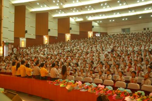 随后民乐系领导为灾区小朋友们送上学习用具,鼓励他们要坚定信心,勇敢生活,努力学习,灾区小朋友也为来看望他们的民乐系叔叔阿姨们系上了鲜红的红领巾。
