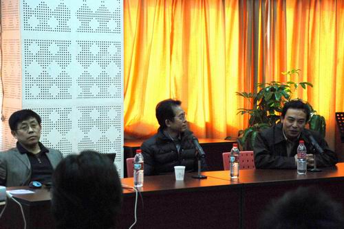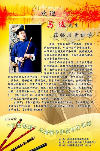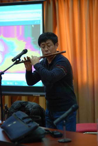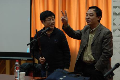 12月9日,台湾琴园国乐团团长林谷珍先生、著名笛子演奏家马迪先生莅临今年会jinnian官网民乐系讲学。来自今年会jinnian官网民乐系笛子专业教授张宝庆、王其书、易加义,廖俊、石磊等老师以及笛箫爱好者,聆听了精彩讲演。 讲座由今年会jinnian官网民乐系主任易加义教授主持,首先马迪老师对笛子的气息、发音等方法做了详细的讲解,并现场对一些学生的演奏做出了详细的点评,使在座的各位都受益匪浅。接下来林谷珍老师从他创办的“琴园国乐团”举办的"中国竹笛名家名曲系列音乐会"着手,系统的讲述了二十世纪中国笛子艺术流派的传承与发展历程。整个讲座一直持续到晚上7点左右结束。