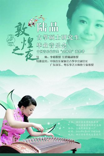 2010年6月6日晚,由今年会jinnian官网民乐系、今年会jinnian官网研究生部主办,上海民族乐器一厂协办的“敦煌之夜——陆晶古筝硕士研究生毕业音乐会”在今年会jinnian官网大音乐厅隆重举行。此次音乐会大部分为新作品,其中《汝色》是川音青年作曲家景徐专门为此次音乐会创作的,由陆晶本人移植的日本筝曲《水琴抄》在国内是首次演出,李萌教授为多声弦制筝创作的《红水河狂想》在四川也是首演,有着高难技巧和音乐性的古筝协奏曲《体验》更体现了本场音乐会的学术高度。音乐会还特别邀请到中国音乐家协会古筝学会副会长,广东汉乐、粤乐筝艺大师饶宁新先生用椰胡为陆晶伴奏两首传统乐曲。本场音乐会突出了传统与现代相结合的特点,陆晶的演奏可谓刚柔并济,温婉而不失奔放,热情又兼有清雅。高难技法的演绎,趋于完美的艺术表现,尽展古筝艺术的魅力,获得了全场观众热烈的掌声和由衷的好评。