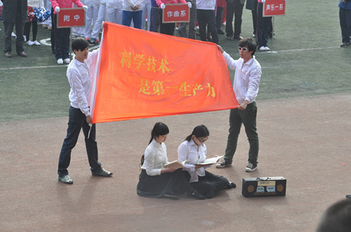 2012年11月8日,在这秋风送爽的季节里,热烈庆祝中国共产党第十八次人民代表大会胜利召开。与此同时,我院运动会在新都校区隆重举行。 我系党总支书记谢勇、主任易加义老师、副主任王英老师、梁云江老师、系学生党支部书记、办公室主任陈娟娟老师、系团总支书记张云希老师及全系师生参与本次运动会。 我系的开幕式表演共分为6个部分。从50年代我们要发展体育运动,增强人民体质;60年代向雷锋同志学习的精神;到70年代向广阔天地,大有作为而努力奋斗;80年代的科技成为第一生产力;到以发展高科技,为实现产业化而奋斗的90年代;再到我们要大力发展文化产业的当今。这一幕幕的画面,放佛把我们都带回到那些年代。作为当代大学生的我们,为祖国的繁荣富强而骄傲自豪。 最后,整个表演以编排新颖,搏人眼球的好评荣获我院2012年冬季运动会入场式表演第一名的佳绩。