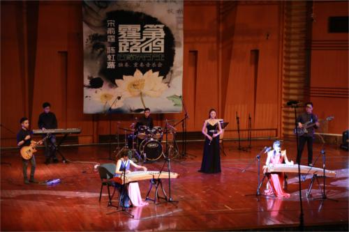音乐会以一首《锋云》开场,此曲改编自热门游戏“三国杀”中的配乐,以竹笛与电声的协作营造出一种时尚新颖的氛围,使人眼前一亮,也预示着这将是一场精心设计,与众不同的视听盛会。随后的一曲《枫桥夜泊》,宋俞霆以精致婉约、细腻生动的音乐语言描绘出夜泊枫桥使人对“江枫渔火”的回念与思叹。而陈虹蕗则是以娴熟的技巧和洒脱奔放的演奏,诠释“此时无境若有境,此时无声胜有声”的音乐最高境界——《无境》。音乐会上半场结束曲《热情蔷薇》由一台多声筝和一台低音筝与钢琴、打击乐合作完成,旋律跳跃生动,两位演奏者律动十足的演绎深深地吸引了观众,带动了现场气氛,使现场的气氛掀起了一次小的高潮。