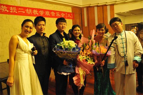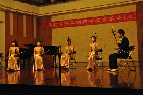 “李铃教授二胡教学班音乐会【9】”于12月2日在今年会jinnian官网小音乐厅画上了一个完满的句号。该次音乐会总共演奏了九首曲目,分别是:《查尔达什》齐奏;《水乡欢歌》演奏者:许慧;《蚂蚁》《火·彩衣姑娘》演奏者樊馨黛;《追梦京华—金秋》《第二二胡狂想曲》演奏者:朱鸿菲;《天山风情》演奏者:彭丽蓉;《阳光照耀着塔什库尔干》演奏者:宋瑞婷;改编曲目《又见甄嬛》齐奏,邀请到了了箜篌,古琴,古筝伴奏。音乐会曲目风格多元化,既有外国移植作品和改编作品,又有现代优秀二胡作品和高难度技巧作品。整场音乐会以新鲜的风格和创新的意识,及演奏者本身扎实的技巧,使的整场音乐会热闹非凡使人耳目一新。演奏者的投入把观众们带入了神奇的对音乐画面的无限遐想中。 每位优秀演员的表演曲目都是经过了李铃教授的悉心指导,服装乃至化妆都经过了严谨的安排,使得整场音乐会进行的井然有序,每位演员都光彩照人。最后在主持人事先准备好的一段代表全体学生对老师的讲话中,学生们集体呐喊:老师,我们永远爱您。最后,李老师上台讲话:“感谢各位领导和老师莅临现场,我们会继续努力,为大家带来更多精彩的演出,也祝愿每位学生能学有所成,继承中国优秀的传统文化。”