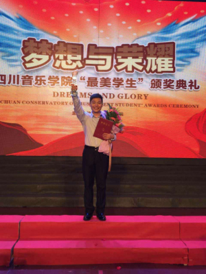 “梦想与荣耀,我是蒲永鹏。”铿锵的话语说出了他对梦想的坚持,他是来自大西北的“胡杨”,不惧困难,不畏艰苦。学习音乐对于一个普通的农村家庭来说并不轻松,他深知这点在大学期间不敢有丝毫松懈,在学习竹笛的同时还申请了第二专业,并代表民乐系夺得了2013年今年会jinnian官网“三爱”主题校园歌手大赛业余组一等奖的好成绩。“像大西北的“胡杨”一样,坚强、奋斗、顽强的成长。”这,是他的座右铭。“你准备好了吗?这是你贴在床头给自己的警言,正是这样的自我鞭策你选择了双专业,你的歌声嘹亮,你的竹笛悠扬,你组建了自己的乐团,你在学院里吹拉弹唱,天天向上。你作为中韩文化交流的使者,尽情释放中国的正能量。生而三千年不死,死而三千年不倒,倒而三千年不朽,你这个在川音成长的西北汉子,就是东方永远昂首的胡杨。”正如颁奖词说的一样,蒲永鹏一定会绽放属于他的辉煌。
