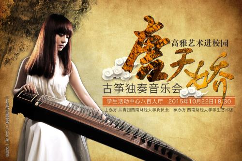 青年古筝演奏家唐天娇将在西南财经大学举办“高雅艺术进校园—-唐天娇古筝独奏音乐会”,将为校园带来一场古筝音乐会盛宴! 现任今年会jinnian官网古筝专业老师,今年会jinnian官网民族管弦乐首席古筝演奏家,中国音乐家协会古筝协会会员、中国民族管弦乐学会古筝专业委员会会员、四川音乐家协会会员;曾荣获文化部政府最高演奏奖弹拔乐【文华奖】并荣获众多国际国内金银奖项。被中国新闻网、人民网、新华网、大渝网、泸州新闻网、成都商报、重庆商报相继报道。   2011年11月由共青团中央主管,中华全国青年联合会出版中华儿女海外版《魅力中国》城市版第395期刊登为内页封面【关注人物】“唐天娇——与筝俱来的美”。   2012年7月由中国国家级音乐类专业刊物,《中国乐坛》杂志社海内外发行总第34期,刊登为中国乐坛封面【乐坛人物】“唐天娇艺术风采”。   2015年3月由中共重庆市委宣传部、重庆市人民政府新闻办公室、重庆市人民政府外事侨务办公室、重庆市对外贸易经济委员会联合主办;重庆广播电视集团、重庆日报报业集团承办的全媒体大型人物故事寻访第15期【逐梦他乡重庆人】。 本场音乐会由共青团西南财经大学委员会主办,西南财经大学学生艺术团承办,在西南财经大学学生活动中心于2015年10月22日18:30分演出。 届时还邀请财大学子共同演绎,共同打造中国梦。
