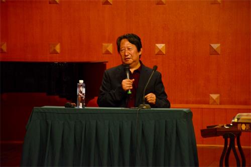 讲座中,赵曼琴先生以陕西风格音乐为切入点,解析陕西筝乐中音乐素材风格特点的同时,和大家分享了他关于器乐演奏音律潜心研究数十年的成果。其间,赵老师多次与在场师生进行互动探讨,并通过现场测音对比,让全场观众真切体会到了器乐演奏与声乐演唱效果差异,从而对其产生的根本原因——律制、听觉选择及演奏(唱)技巧三者之间的异同联系有了更深刻的理解和认识。