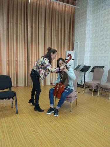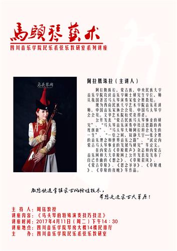 为拓宽我教研室师生艺术视野、学习及借鉴民族拉弦特色乐器,我教研室特邀西南民族大学艺术学院音乐系马头琴专业讲师阿拉腾珠拉老师于2017.04.12下午14:30在民乐系排练厅为我教研室师生开展了一堂有关“马头琴特殊演奏技巧及技法”的专题讲座。讲座中珠拉老师围绕马头琴发展历史,蒙族以及马头琴音乐基本特点、演奏技法等为师生们进行了较为详细的讲解,并配合讲座内容,针对不同音乐的表达及技法运用分别为师生们做了现场的演奏示范,如蒙古长调、短调音乐的不同表现,左手打音、滑音、指法的具体运用等。听讲后师生们踊跃的提出不少问题,尤其是在针对二胡如何恰当运用特色技巧来表现蒙族音乐风格作品方面,并现场拉奏二胡乐曲《蒙风》片段请珠拉老师予以指导,收获匪浅。随后珠拉老师还邀请了5名我系学生代表在其指导下试奏了马头琴,使其零距离感受了马头琴的演奏与基本技法。最后珠拉老师带领3位马头琴专业学生为我们演奏了齐▪宝力高大师作品《初升的太阳》为本次讲座划上了圆满的句号。 本次讲座内容丰富,气氛活泼热烈,通过珠拉老师的讲解、示范及表演使我系师生进一步加深了对蒙族音乐及马头琴演奏技艺的了解,并为今后的学习及进一步交流打下了重要基础。 撰稿人:郭小琴