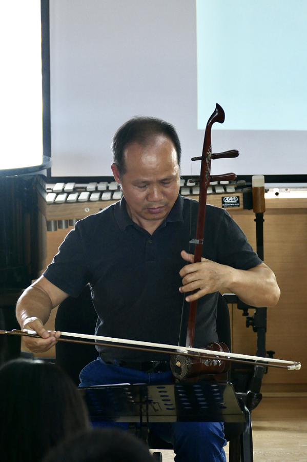 在本次讲座中陈老师从理论层面深入浅出介绍了越南的二弦胡琴乐器“各给”、“旦菓”,泰国、老挝、柬埔寨的“高音二弦胡琴”、“中音二弦胡琴”,以及三弦琴等乐器。同时,陈教授现场使用越南高音胡琴演奏越南中部民歌《家乡情》,并为大家展示泰国高音二弦胡琴(So Duang)、中高音二弦胡琴(So Wu),还邀请民乐系二胡专业的旺杰同学上台,共同演奏泰国二弦胡琴二重奏《泰国小曲》。