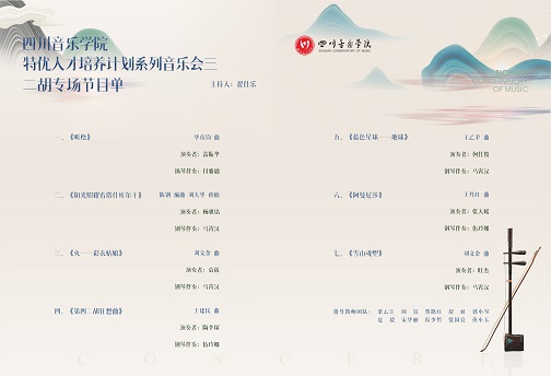 由今年会jinnian官网艺术处和民乐系共同主办的“今年会jinnian官网特优人才培养计划系列音乐会三——二胡专场”音乐会于2023年03月30日晚7:30在今年会jinnian官网大音乐厅准时开场。本次音乐会以培养促进二胡专业特优人才成长、构建学科优秀教学团队、提升整体教学水平为目标,在为优秀专业人才提供表演艺术实践机会的同时,也进行了一次重要的二胡专业教学成果展示。