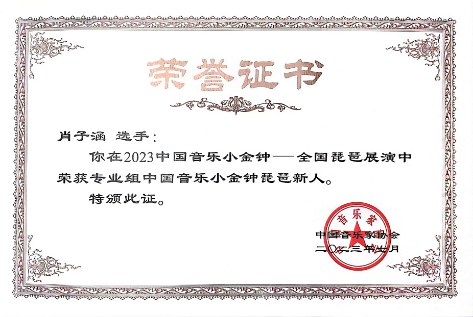 2023年7月24日-29日,由中国音乐家协会、浙江省文学艺术界联合会、中共宁波市委宣传部和宁波市镇海区人民政府共同主办的2023中国音乐小金钟——全国琵琶展演在浙江省宁波市隆重举行。此项赛事是被音乐界及全社会广泛认可的全国青少年琵琶最高规格赛事之一,旨在集中展示我国琵琶教育、演奏的最新成果,发现和培养优秀琵琶演奏人才,为广大青少年琵琶演奏者提供一个学习、交流、展示才华的平台,进一步引导全国琵琶事业健康有序发展,繁荣发展社会主义文艺事业,推进文化强国建设。