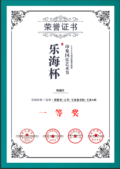 7、附中初一陶越佳,荣获乐海杯 印象国乐艺术节全国决赛(复赛)古筝专业少年组 一等奖。