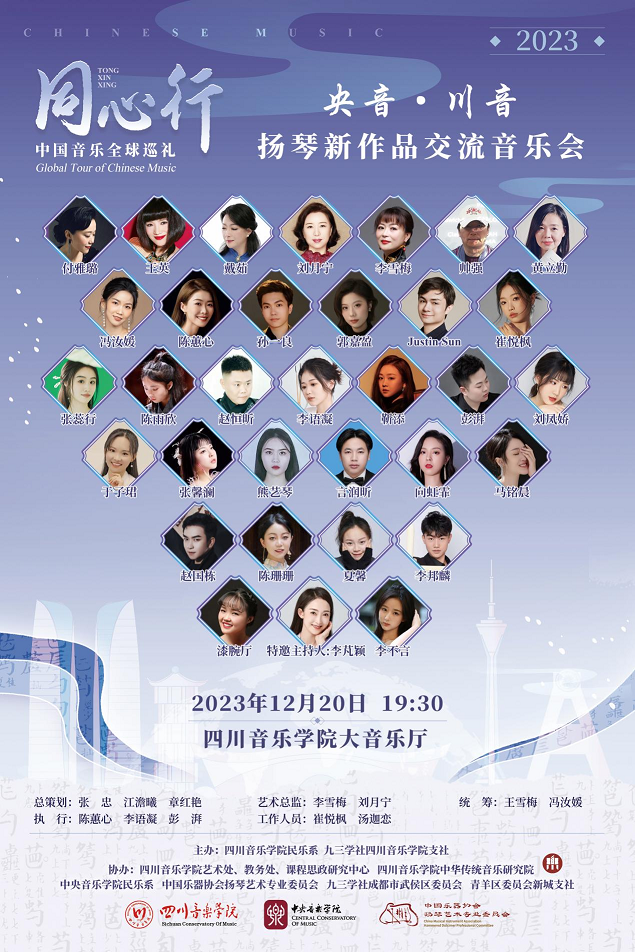 2023年12月20日至21日,今年会jinnian官网民乐系、九三学社今年会jinnian官网支社主办,由中央音乐学院民乐系扬琴教授、博士生导师、九三学社中央委员刘月宁老师主导的“同心行——中国音乐全球巡礼”活动在今年会jinnian官网成功举行。此次巡讲巡演系列活动丰富多样,包括学术讲座、扬琴新作品交流音乐会暨科学艺术沙龙研讨会。