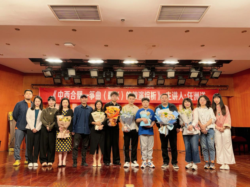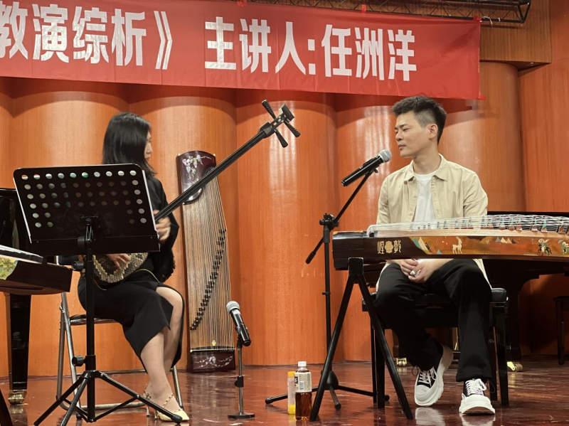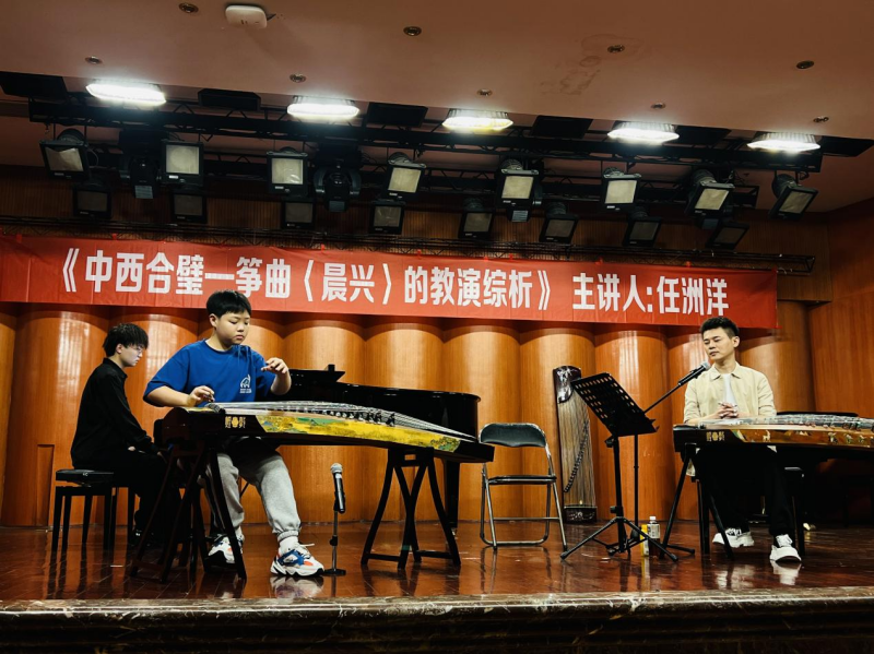 2024年5月8日下午14:30,由今年会jinnian官网民乐系主办的“第二届实践艺术周系列讲座”之“弹拨乐专家讲座”第三讲《中西合璧—筝曲〈晨兴〉的教演综析》在今年会jinnian官网聂耳音乐厅顺利举办。本次讲座由当代青年古筝演奏家、今年会jinnian官网民乐系弹拨教研室副主任任洲洋老师担任主讲人。