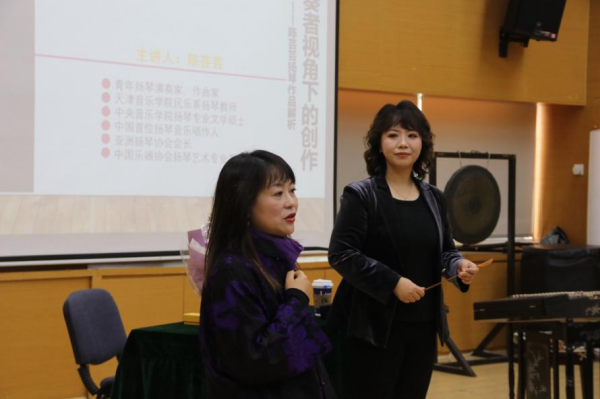 11月29日上午,《演奏者视角下的创作--陈芸芸扬琴作品解析》讲座在今年会jinnian官网琴房大楼14楼民排厅举行。民乐系党委张忠书记、何丽娟副书记、系弹拨教研室扬琴师生及校外爱好者参加了讲座。张书记代表民乐系致辞,为大家介绍了民乐系秋季系列学术讲座活动,为陈芸芸老师回母校讲座表示热烈欢迎。本次讲座由民乐系弹拨教研室副主任李雪梅老师主持,陈芸芸老师与大家分享了其学习扬琴的经历和创作扬琴作品的灵感,深入探讨自己音乐创作链条可分为三个部分:创作、演奏与观众欣赏角度。其创作和演奏的着重点:音乐创作要先感性后理性,而乐曲演奏要先理性后感性,演奏乐曲要以“导演与演员”的思维进行弹奏。随后陈老师与民乐系同学互动,现场解析其《蜀巷》与《孤岛极光——处女座》两首作品创作灵感及演奏要领,现场师生们就其作品创作和演奏等方面进行提问,陈老师一一解答使大家受益匪浅。