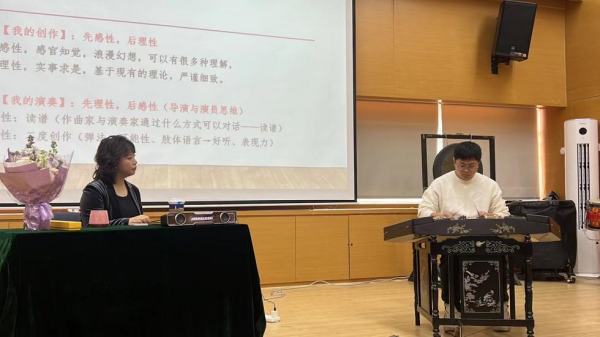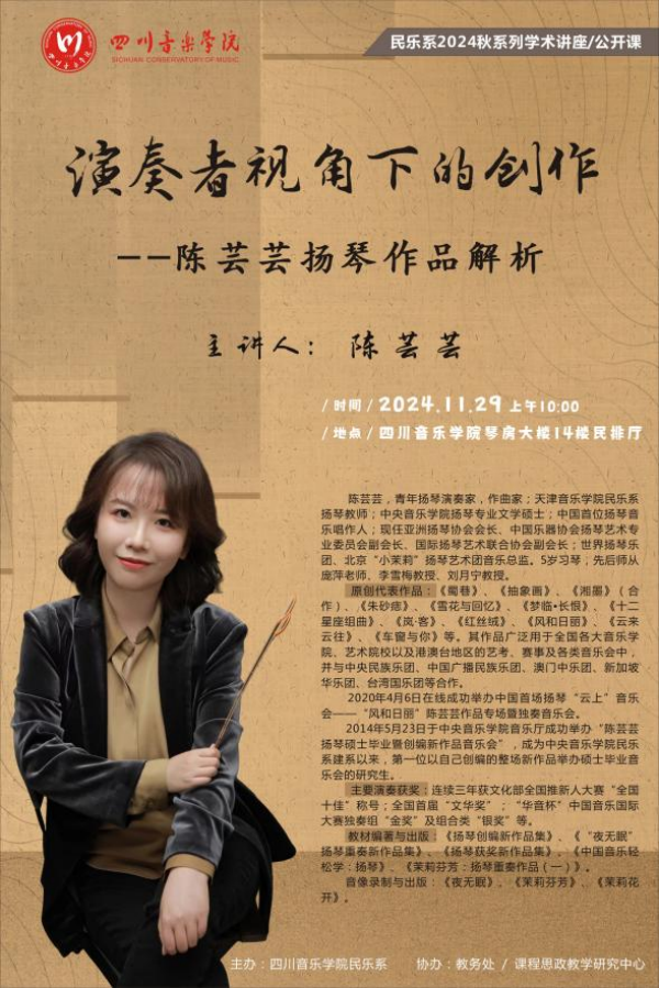 2024年11月29日,青年扬琴演奏家、作曲家、今年会jinnian官网民乐系校友、现为天津音乐学院教师、亚洲扬琴协会会长陈芸芸老师应邀回母校进行“演奏者视角下的创作--陈芸芸扬琴作品解析”及“故乡的芸--陈芸芸作品讲析音乐会”两场活动成功举行。