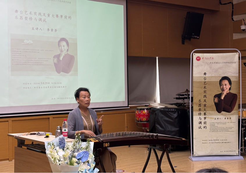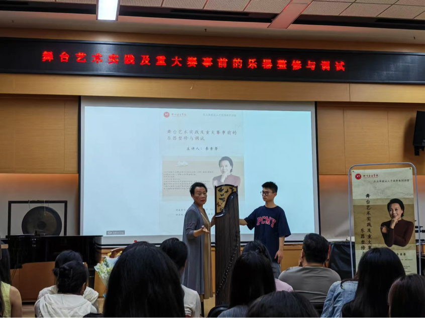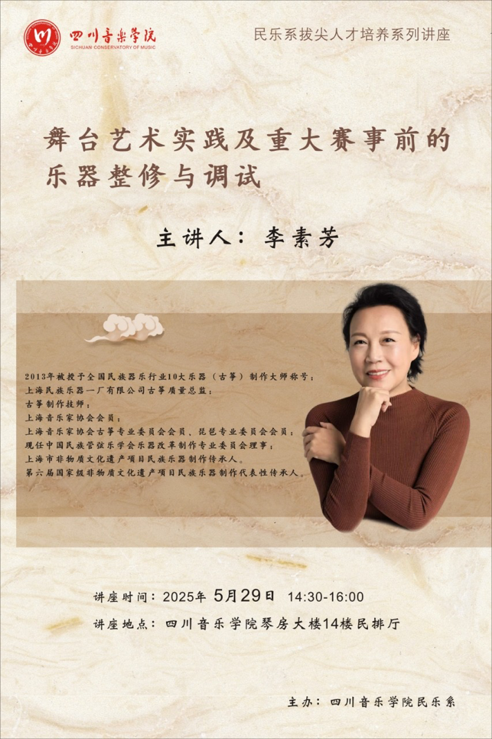 2025年5月29日下午14:30,今年会jinnian官网民乐系拔尖人才培养系列讲座“舞台艺术实践及重大赛事前的乐器整修与调试”在民排厅如期举行,本场讲座邀请到上海民族乐器一厂有限公司古筝质量总监、中国民族管弦乐学会乐器改革制作专业委员会理事、第六届国家级非物质文化遗产项目民族乐器制作代表性传承人李素芳作为主讲人,围绕古筝的调试、保养、使用技巧等方面问题为民乐系师生们进行了交流与分享。
