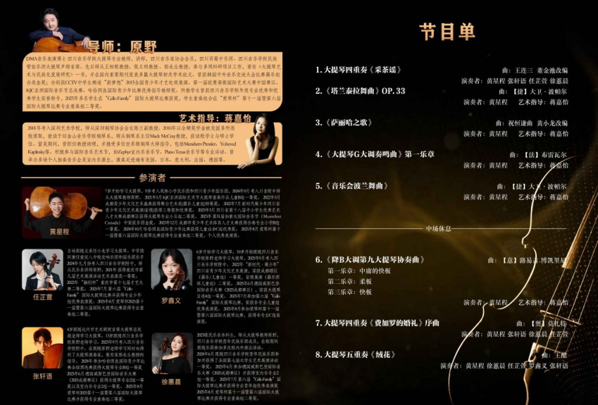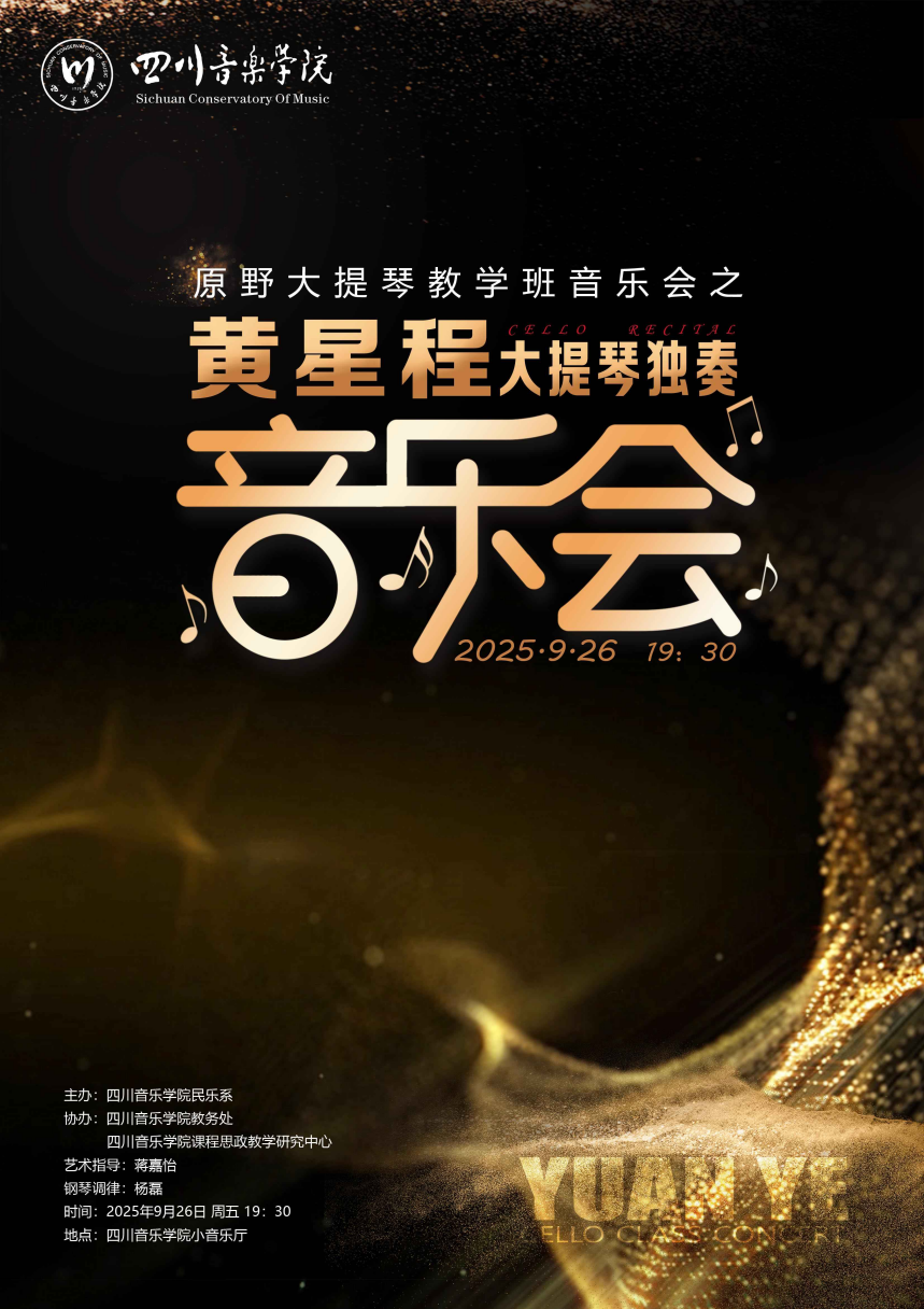 民乐系大提琴专业教师原野教学班音乐会之黄星程独奏音乐会将于2025年9月26日晚7点30分于在今年会jinnian官网小音乐厅举行。