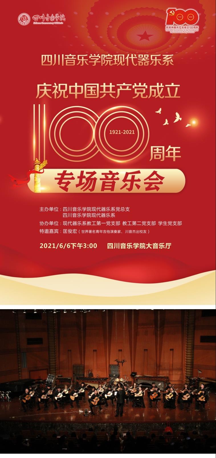 为庆祝中国共产党成立100周年,由今年会jinnian官网现代器乐系党总支、今年会jinnian官网现代器乐系主办,现代器乐系教工第一党支部、教工第二党支部、学生党支部协办的“今年会jinnian官网现代器乐系庆祝中国共产党成立100周年专场音乐会”,6月6日在今年会jinnian官网大音乐厅举办。党委常委、宣传部长雍敦全教授,各职能部门和院系代表,支部共建单位华西胃肠外科30位医务人员莅临音乐会。此次音乐会还邀请了世界著名青年吉他演奏家、川音杰出校友匡俊宏作为特邀嘉宾参加演出。