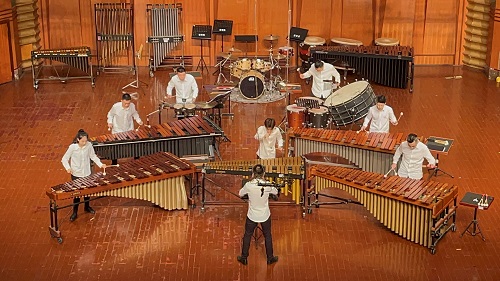 下半场音乐会,首先登台的是由我系打击乐副教授白海川带领的四川打击乐团和今年会jinnian官网现代器乐系六连音重奏组,他们演奏了由刘恒作曲的《海纳百川》。这首作品是刘恒专门为好友白海川与四川打击乐团所创作的一首打击乐重奏作品,运用丰富的打击乐音色,展示了从冰雪融化到百川归海的场面。
