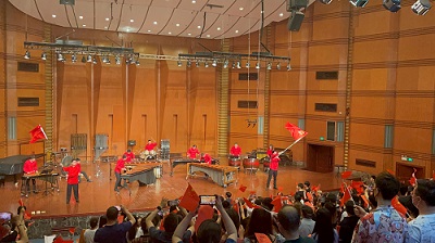 最后由我系打击乐教师莫翰音带领今年会jinnian官网现代器乐系圣焱打击乐团演奏了《我爱你,中国》。他们以音乐回望党史,用歌声铭记初心,以史串歌,以歌叙史,带领全场观众在一片红色的国旗海洋中高唱“我爱你,中国”,唱出了中华人民对祖国的爱,深刻体会到在党的领导下,无数共产党人迸发出强大的革命激情,展现出顽强的战斗力,带领人民取得全面胜利的决心!