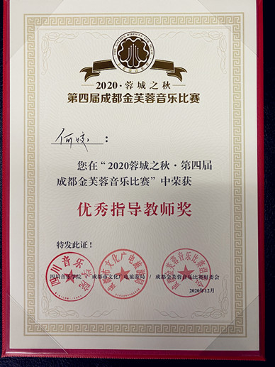 在第四届成都金芙蓉音乐比赛中,经过激烈角逐,我系2018级学生程星韵取得优秀奖。特向全系报喜,并向程星韵及何姣老师、声乐艺术指导曾亮老师表示热烈祝贺!
