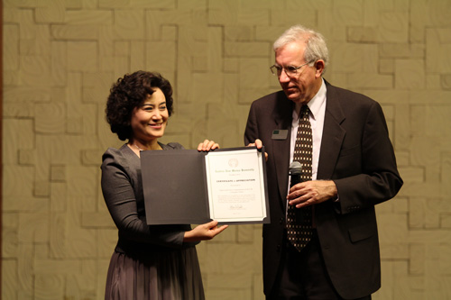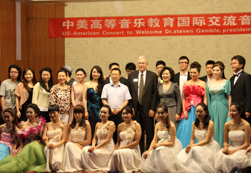 5月23日晚7点30,学院小音乐厅人声鼎沸、人头攒动,由今年会jinnian官网外事处、歌剧与合唱系主办的“中美高等音乐教育国际交流音乐会”在今年会jinnian官网小音乐厅成功举行。莅临音乐会的有美国东新墨西哥大学(ENMU)校长史蒂文.盖博博士、我院副院长孙洪斌副教授、系主任张莉教授、系党总支书记刁锡强以及全系师生。 这台精品音乐会由15个节目构成,涵盖了舞蹈、独唱、合唱、钢琴、武术等各门类艺术表演形式,而我系师生用了仅仅三周的时间排练,就让观众享受了一场视听的盛宴,展示了歌剧合唱系师生的综合艺术素质和办学特色。时长一个半小时的节目中不仅保留了传统美声歌剧独唱曲目,也新增了颇具地方民族戏剧特色的《亲疙瘩下河洗衣裳》,还有从美国东新墨西哥大学留学归来的学子汇报演唱的二重唱《费加罗的婚礼》、《唐璜》选段。而青年教师们也用丰富的舞台表演经验诠释了歌剧选段《笑之歌》和爵士歌曲《A Nightingale sang in Berkely Square》。 与以往的音乐会不同,此次音乐会活泼而不失严肃,热闹而不失分寸,台上台下互动热烈,掌声雷动,观众们久久不愿离去,沉浸在今夜无人入眠的兴奋中。这标志着歌剧与合唱系两年来的办学成果已初见成效,今后还会继续加强对外交流合作,将教学质量提高到一个新的高度!