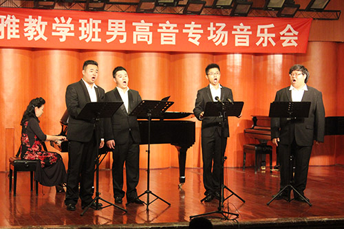 2013年6月19日晚7点30分,唐竹雅教学班男高音专场音乐会在今年会jinnian官网聂耳音乐厅成功举行。音乐厅内气氛热烈,座无虚席。歌剧合唱系的很多专业老师也莅临本场音乐会。    本次音乐会由声乐一系4名本科学生参加,他们通过独唱及重唱的形式,很好的展现了男高音的演唱特点。担任音乐会钢琴伴奏的是声乐一系的郭永厚教授,音乐会在轻松愉快的气氛中进行,学生们顺利的完成了本次舞台实践活动,并丰富了自己的舞台经验。   唐竹雅老师对学生们音乐会顺利结束表示祝贺,给予了学生们极大的鼓励,同时提出了更高的要求。希望学生们继续努力,在声乐道路上走得更高、走的更远!