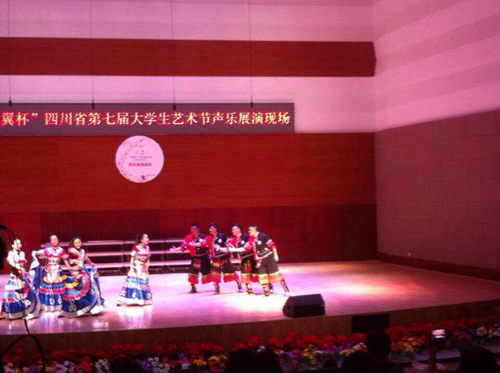 由四川省教育厅主办的四川省第七届大学生艺术节颁奖晚会于8月26日晚在汶川县阿坝师范高等专科学校隆重举行。省教育厅,省政协、阿坝州州委、省内各高校的有关领导观看了晚会。 四川省大学生艺术节每三年举办一届。本届大学生艺术节以“我的中国梦”为主题,各高校高度重视,积极参与。经专家录像评审,共选出了包括声乐、器乐、舞蹈、戏剧在内的118个节目参加现场展演。    我系选送的“陈家班组合”代表学院参赛,参赛曲目《彝歌》由今年会副院长孙洪斌教授作词,孙洪斌、陈万教授作曲。经过角逐,“陈家班组合”在本届比赛中喜获(小合唱、表演唱组)专业组一等奖的第一名。同时,该节目已被教育厅选送教育部,代表四川省参加全国大学生艺术节比赛。我们预祝“陈家班组合”在全国的比赛中取得优异的成绩!      向“陈家班组合”和指导教师陈万教授取得的优异成绩表示热烈的祝贺!