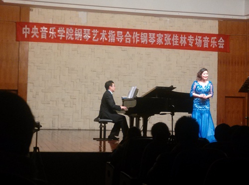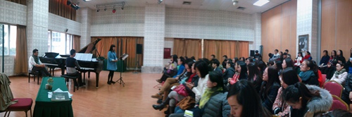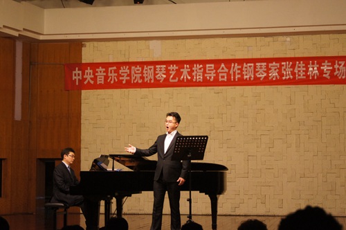 2014年12月8日——9日中央音乐学院硕士研究生导师、合作钢琴家、音乐撰稿人、声乐歌剧系钢琴伴奏及艺术指导教研室主任张佳林副教授应歌剧合唱系声乐艺术指导教研室之邀,来我系进行了为期两天的讲学活动。 此次的讲学活动分为三个内容:《欧洲歌剧的风格演变与钢琴伴奏》的讲座、公开课、专场音乐会。讲学期间,张佳林老师对声乐艺术指导教学及演奏等问题和师生们进行了相互交流,大家积极踊跃发言,讲学精彩纷呈,师生受益匪浅。特别值得一提的是音乐会所有曲目的钢琴伴奏由张佳林老师担任,演唱者由我系青年教师演唱。音乐会的成功举办,为为期两天的讲学活动画上了圆满的句号。