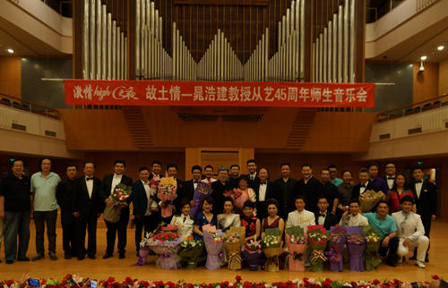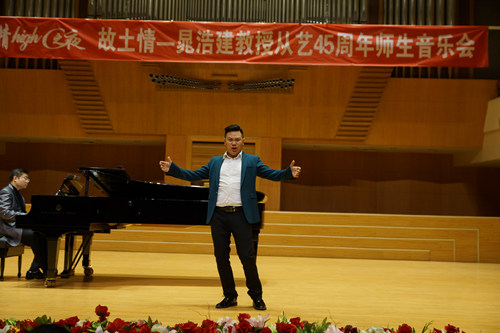 5月18日晚,著名声乐教育家晁浩建先生“故土情-晁浩建教授从艺45周年师生音乐会”在北京音乐厅隆重举行。我系陈万教授受邀参加演出并演唱了自己的原创作品《练声》,受到同行和现场观众的高度肯定和热烈欢迎。特别是受到了到场的著名艺术家的胡松华老师和歌唱家阎维文老师的大力赞扬。当晚参加演出的还有王宏伟、杨阳、张博、郝亮亮、万丹、甘露露等一大批晁浩建老师培养的优秀歌唱家。