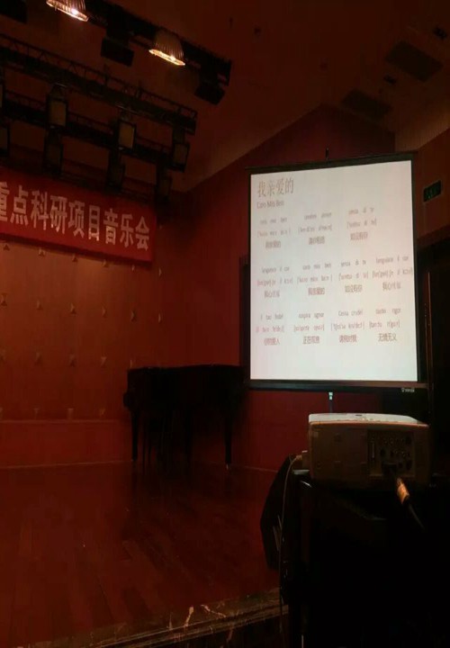 12月22日,由我系唐竹雅老师负责、主持,参研团队成员:我系青年教师张运超,叶琤,郭莹,徐子雯共同研究,由我系艺术指导教师谭赟、吕晴担任钢琴伴奏的院级重点科研课题《国际音标在外国歌曲中的应用》科研音乐会在星海音乐厅成功举办。 音乐会将研究成果一一运用在了意大利语、德语和法语歌曲的演唱中。整场音乐会每首歌曲钧用国际音标标注,并突出标注出了易错发音,音标与演唱实际结合等核心成果都在现场用投影仪投放在大屏幕上供专家,老师,观众现场指导和参考。参加音乐会的12名学生都是来自课题组成员的声乐教学班,他们通过课题研发成果,逐字逐句纠正外语发音,现场实际演唱效果都得到了观众的一致肯定。尤其是该课题对中国歌曲同样可以使用国际音标的延伸研究更是音乐会的亮点。 本次科研项目音乐会的成功举办,标志着我系科研与实际声乐教学相结合已经迈出了一大步,但仍然还需要课题组全体师生继续努力和研究,争取创造新的高度与成果。
