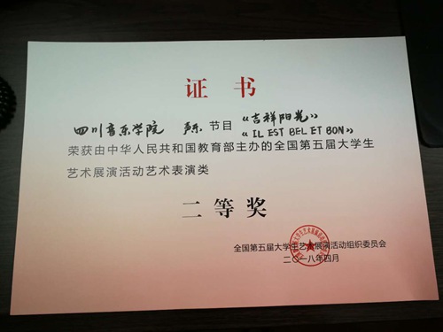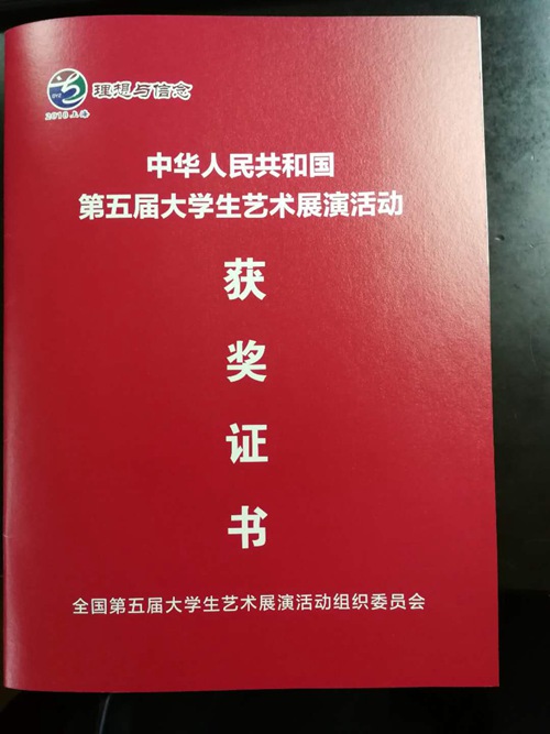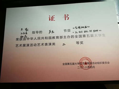 二0一八年四月歌剧合唱系学生合唱团合唱节目代表学院,参加了由中华人民共和国教育部主办的全国第五届大学生艺术展演活动,荣获艺术表演类二等奖。 同时,朱曦、江百灵、杨莉三位老师荣获指导教师奖。