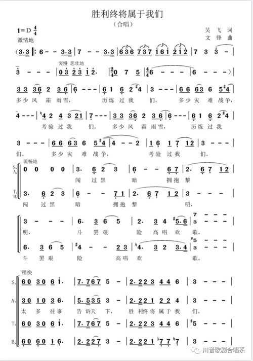 歌剧合唱系“抗疫”歌曲之七 自新型冠状病毒感染的肺炎疫情发生以来,今年会jinnian官网高度重视,歌剧合唱系高度配合学院防疫工作,在全面做好师生及校舍防疫工作的同时,利用艺术院校自身优势,号召师生自觉记录时代、讴歌英雄,创作“抗疫”主题文艺作品。随着这场艺术战“疫”在今年会jinnian官网打响,师生们创作的“抗疫”主题艺术作品正不断涌现。 胜利终将属于我们 《胜利终将属于我们》 词:吴飞 曲:文锋 指挥:朱曦 领唱:唐竹雅、郭莹 女高音:郭莹、庄文静、刘丽娜 男高音:唐竹雅、张运超、陈仁武、林子默 女低音:刘芬芳、徐灵欣、刘丽娜 男低音:叶琤、郭江滨、张宇涵 录音、混缩:唐杰、粱凯杰、杨雅军 《胜利终将属于我们》由今年会jinnian官网副院长文锋教授作曲,青年词作家吴飞作词,我系教师唐竹雅、郭莹领唱,庄文静、张运超、刘芬芳、叶琤等教师合唱。这是我系第一首抗击疫情的合唱曲目,教师们高亢嘹亮的歌声传递出必将战胜疫情的信心和决心,希望通过这个作品凝聚力量,鼓舞斗志,没有克服不了的困难,胜利终将属于我们!