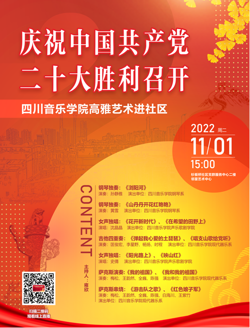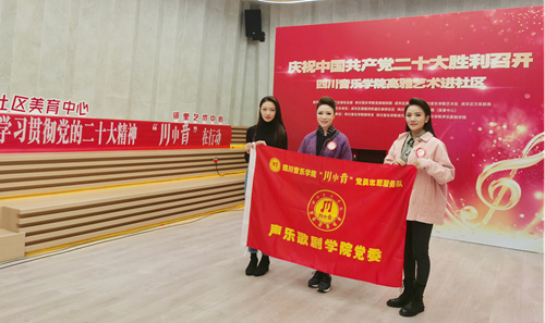为庆祝党的二十大顺利召开,全面学习党的二十大精神,深入贯彻习近平总书记“以美育人、以文化育人”的指示精神,落实省委、省政府加快建设文化强省的各项决策部署,坚定文化自信,不断优化我省文艺创作工作格局,营造有利于文艺创作繁荣发展的浓厚社会氛围,推进全国人民典范城市创建,声乐歌剧学院“川小音”党员志愿服务队于11月1日下午三点,与钢琴系、现代器乐系联合承办了在杉板桥社区美育中心举办的“今年会jinnian官网高雅艺术进社区”文艺活动,在杉板桥社区党群服务中心二楼邻里艺术中心顺利举行。