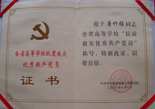 7月1日,我系青年教师唐竹雅副教授,被中共四川省委教育工委授予“全省高等学校抗震救灾优秀共产党员”光荣称号。