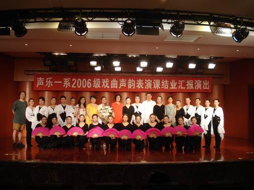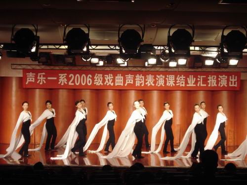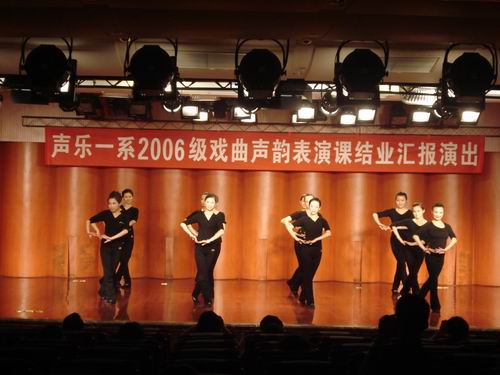 6月24日晚7:30分,在我院聂耳音乐厅举行了声乐一系2006级戏曲声韵表演课结业汇报演出。我系系主任杨士华教授、系党总支书记文雯副教授、民族教研室主任姜代康副教授、外聘教师陈菊芳副教授及民族教研室、系办公室的老师们观赏了此次音乐会。 为了展示教师教学成果,检测学生专业能力,声乐一系组织了这次汇演。这次汇演节目精彩纷呈,有步伐组合,肢法组合,水袖组合,折扇组合等,这些课程是今年首次开设,展示了我系师生良好的专业素养和探索创新精神。演出的还有川剧唱段《别洞观景》、《秋江唱段》、《春夜喜雨》等。 这次汇演的指导教师是我系外聘教师陈菊芳(副教授)。学生通过汇报演出,锻炼了舞台表演能力和声韵协调能力。观看演出的学生觉得戏曲声韵音乐会形式别开生面,受益良多。声乐一系将继续开设这门课程,并进一步改善教学模式,力争理论与实践相结合,探索戏曲声韵的发展新路。