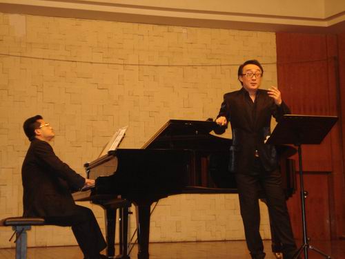 12月13日下午14点30分,为纪念德国著名作曲家舒曼诞辰200周年,声乐一系特邀请旅德男中音歌唱家刘嵩虎博士和著名钢琴艺术指导吴龙教授在小音乐厅成功举行了交流音乐会,他们成功演绎了舒曼的声乐套曲OP:48《诗人之恋》。该作品创作于被称为舒曼的“歌曲年”的1840年,这一年作者与其深爱的克拉拉结婚,它可以说是舒曼的爱情日记。作品共包括十六首声乐作品,歌词来自海涅的《抒情的间奏》的六十五首诗。这组作品不仅是舒曼声乐作品的典型代表,而且也是艺术结构最完整的杰作。刘嵩虎博士运用高超的声乐技巧和丰富的艺术表现力表达了作品中复杂的情感和心理,吴龙教授则用钢琴清透的音色和细腻的情感处理和人声进行了对话,他们精彩的演绎把观众们带入了舒曼浪漫的诗意境界。 音乐会后,两位专家和本系老师进行了专业交流,并现场指导了三名青年教师,从艺术表现、风格把握、语言等方面进行了细致的指导,全系师生都收获颇丰。