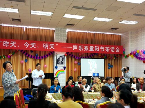 九九重阳,丹桂飘香。10月28日下午,声乐系举办题为“昨天、今天、明天”重阳节茶话会,多位声乐系退休教师“回家”和在职教师欢聚一堂,同庆重阳佳节,共谋声乐系发展。 茶话会由声乐系主任杨士华,声乐系党总支书记江向东主持,会议在一片欢乐、祥和的气氛中进行。声乐系主任杨士华与党总支书记江向东首先代表全体声乐系教师向为声乐事业付出辛劳的各位声乐系老领导、老专家致以诚挚的节日问候和美好的祝福,并向各位老领导、老专家介绍了声乐系近期各项工作开展情况、取得的成绩,以及当前声乐系发展面临的新问题和今后的发展思路。   在座谈中,老教师们踊跃发言,对声乐系在新一届领导班子的带领下所取得的卓越成绩以及发展变化表示由衷的赞赏和自豪,对声乐系领导和同事的关心、爱护深表谢意。同时就声乐系队伍建设、基础设施建设等提出了一些宝贵的意见和建议。莫道桑榆晚,为霞尚满天,与会老教师一致表示退休不退志,坚决发挥好各自的余光余热,关注声乐系发展,支持系里工作,坚持老有所为,为声乐系各项工作实现新的、更大的跨越贡献自己的力量,为声乐系的崛起、再创辉煌,做出自己应有的贡献。