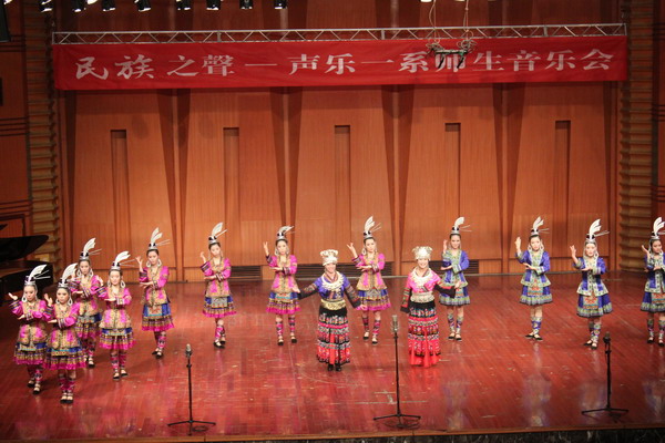 11月21日晚7:30分,“为祖国歌唱,为十八大献礼——民族之声”声乐一系师生音乐会在我院大音乐厅隆重上演。院长易柯、党委副书记文云英、副院长孙洪斌及兄弟院校(系)观看演出。这台音乐盛会是我系师生花了长达两个月的时间创作的。 音乐会上,老师们用歌声表达对祖国的爱,学生们用舞姿跳去心中的激情,节目层出不穷,缤纷多彩,师生载歌载舞,充分展示我系学生多才多艺的舞台表现能力,同时,也是我系教学成果的展示。演出效果良好得到学院领导的高度赞扬。