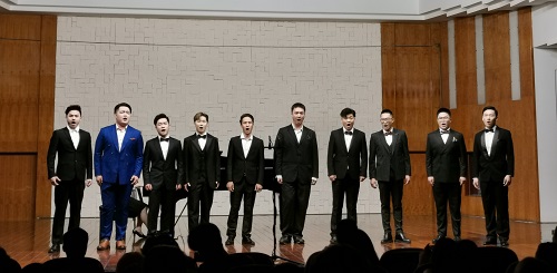 选自韦伯的歌剧《自由射手》中的男生小合唱《猎人合唱》是一首脍炙人口,有较大难度的四声部合唱,德国民间舞曲音乐元素的加入使合唱富于弹性,旋律活泼奔放,强弱对比十分丰富。而另一首男小合《海港之夜》则深情安静,委婉柔和。10位男生把两首风格迥异的歌都演绎得十分精彩,观众报以热烈的掌声。